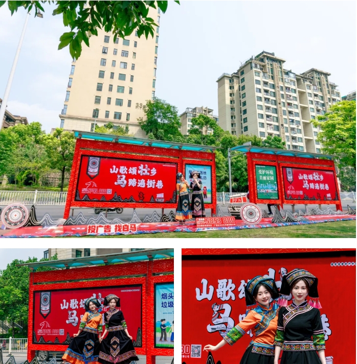 三月三,穿傳統(tǒng)服飾過節(jié)必不可少。瞧,公交候車亭也穿上了節(jié)日的盛裝,鮮艷的色彩、精美的圖案,濃濃的民族風情,為城市增添了一道亮麗的風景,營造了濃厚的節(jié)日氛圍。圖為賽揚傳媒公司員工身著傳統(tǒng)服飾在公交候車亭旁合影。