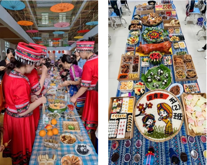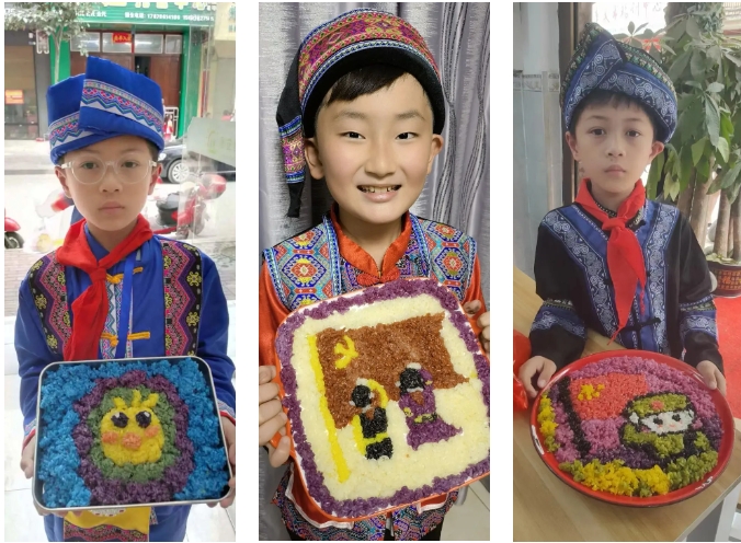 “長桌宴”又稱合攏宴,是侗族、苗族、瑤族等多個民族的風俗習慣,常用于接親嫁女、滿月酒、村寨聯(lián)誼等宴飲活動,代表最為隆重的待客禮俗,已有幾千年歷史。“長桌宴”上有壯族特色的五色糯米飯、艾葉糍粑、壯粽,苗族的傳統(tǒng)佳肴,還有黎族的三色飯……一份份美食造型美觀、色彩鮮艷、香味撲鼻。圖為集團職工拍攝的孩子參加學?!叭氯被顒印?/span>