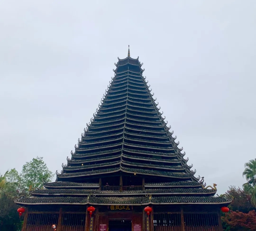 仰觀閃閃魔幻,感受侗族建設(shè)的精美藝術(shù),把疏密、粗細(xì)、剛?cè)岬韧昝赖亟Y(jié)成一個(gè)整體,展現(xiàn)侗族工匠的精美建筑技藝。不用一顆鐵釘,結(jié)構(gòu)十分嚴(yán)謹(jǐn)穩(wěn)固。樓內(nèi)四根杉木大柱直徑都超過70厘米,樹齡均在百年以上,這在鼓樓建筑史上是唯一的。
